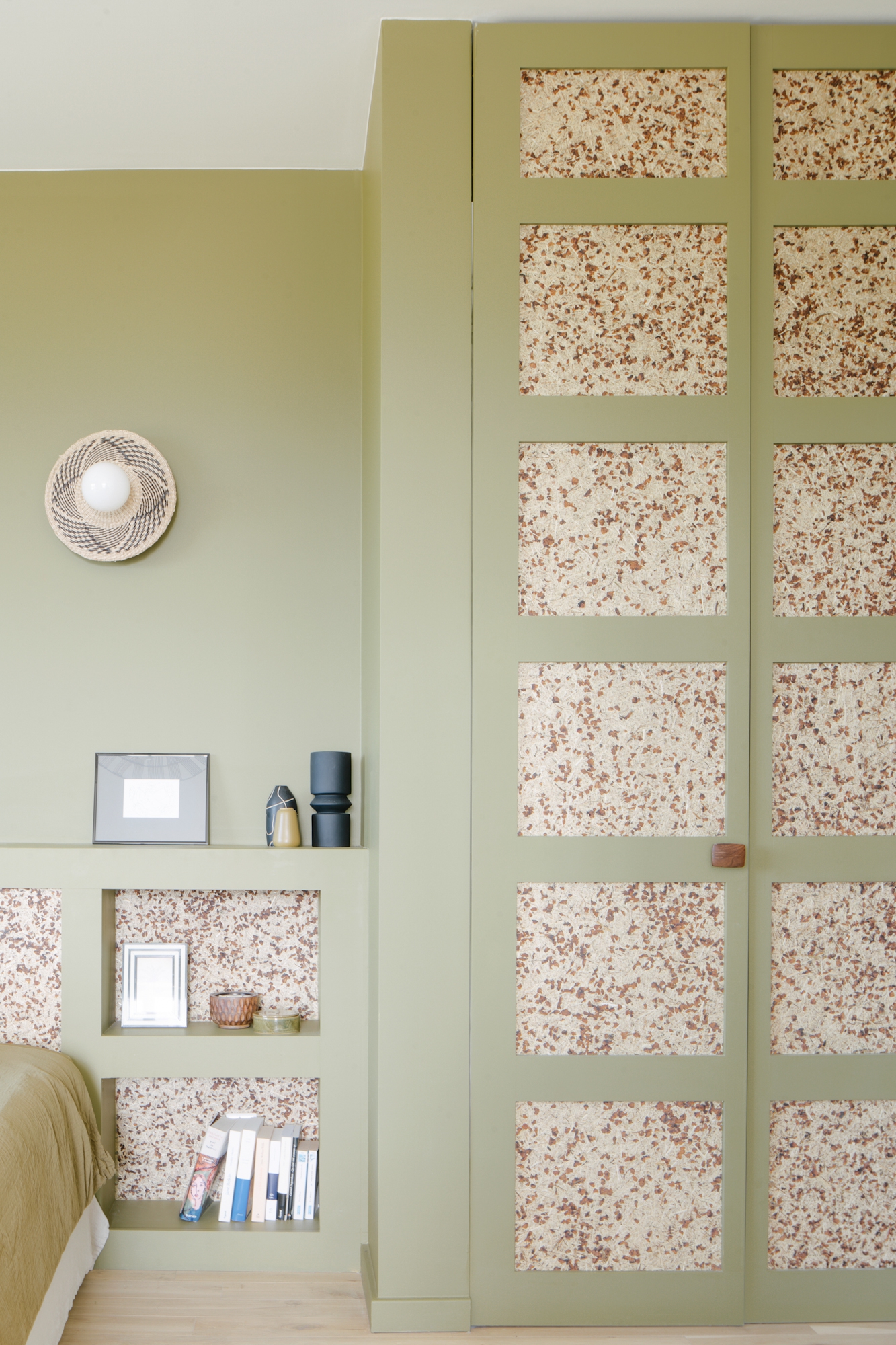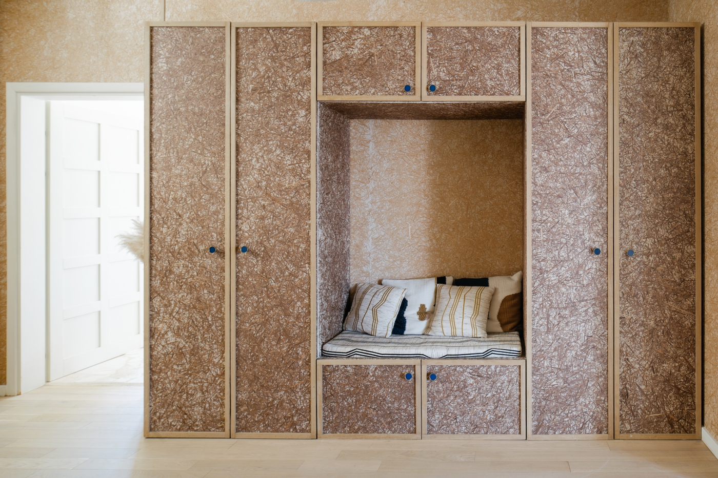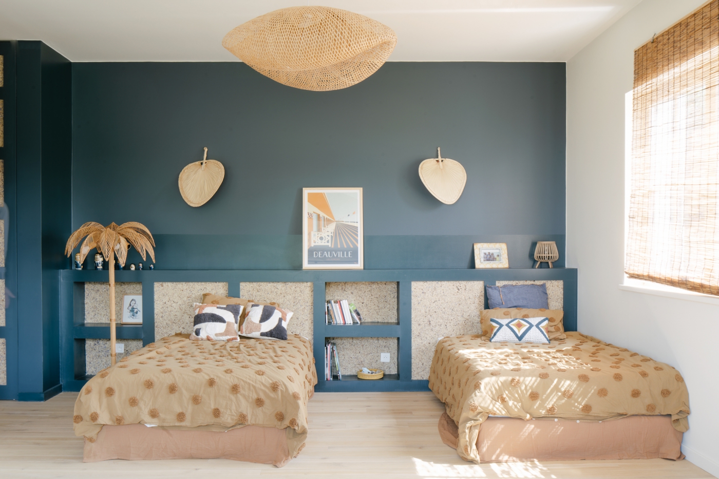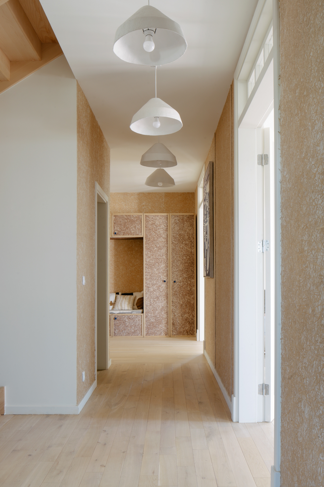 The architectural firm Bateaumagne has completely redesigned this atypical 500 m² seaside villa. A true family cocoon, this haven of peace reflects the owners' artistic universe. The Paille de Noyer and Paille de Chêne models from the SuperOrganic collection blend in perfectly in this case. They cover the walls of the corridors leading to the bedrooms and bathrooms like an invitation to calm. These two eco-designed models have been specially created by Oberflex with wood veneers from our production recovered during the cutting of the veneer sheets. The "Alpage and Cornflowers" and "Alpage and Roses" models bring a floral and olfactory touch to the rooms.