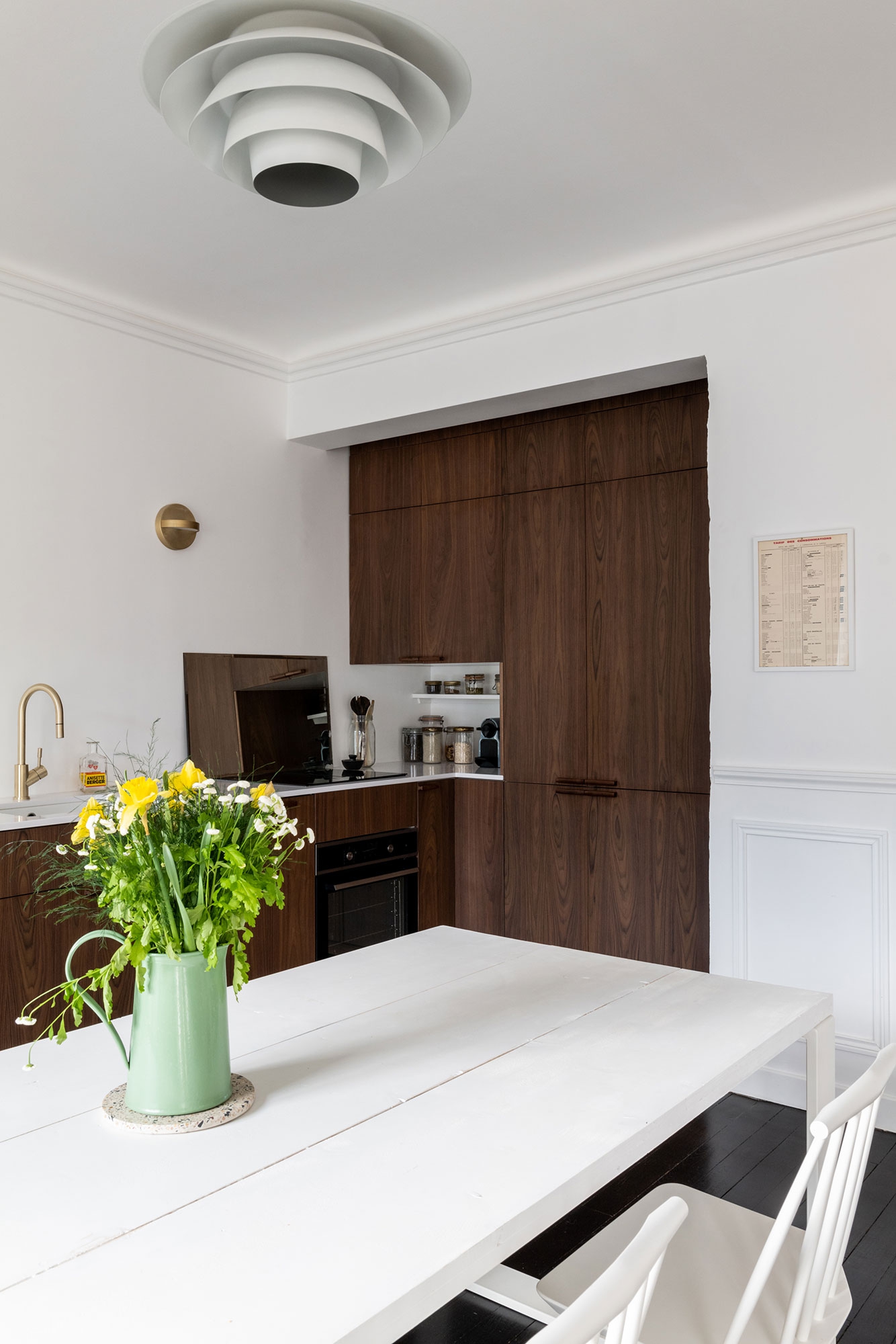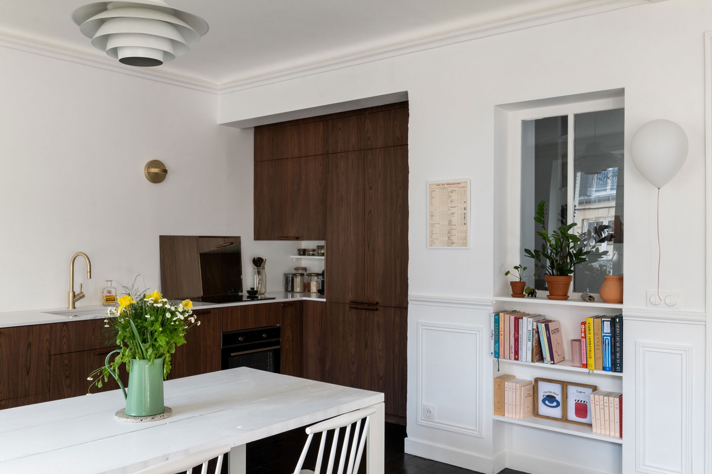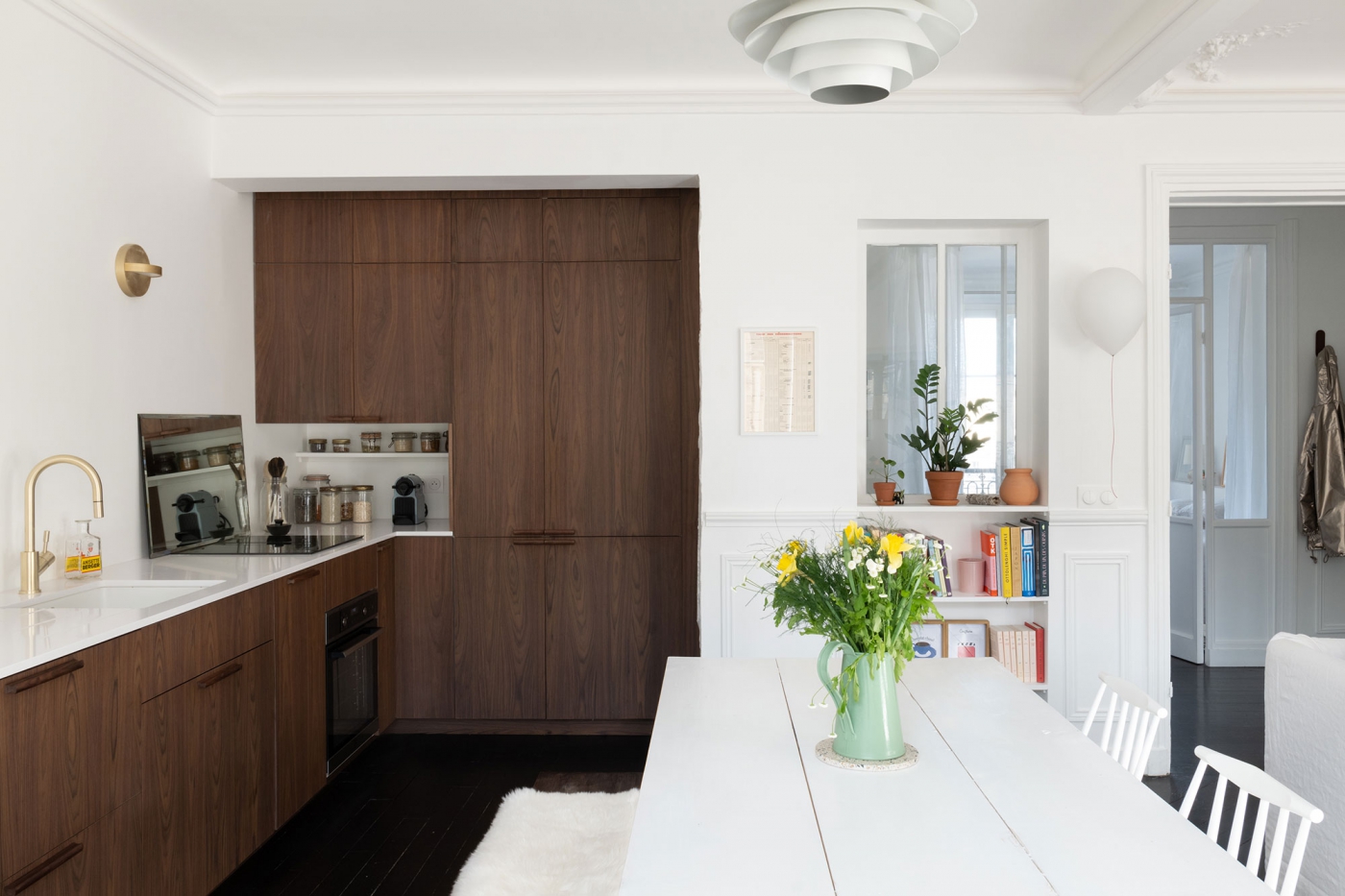Renovation of a 90 square metre flat in the 18th arrondissment of Paris, with a sublime walnut kitchen.