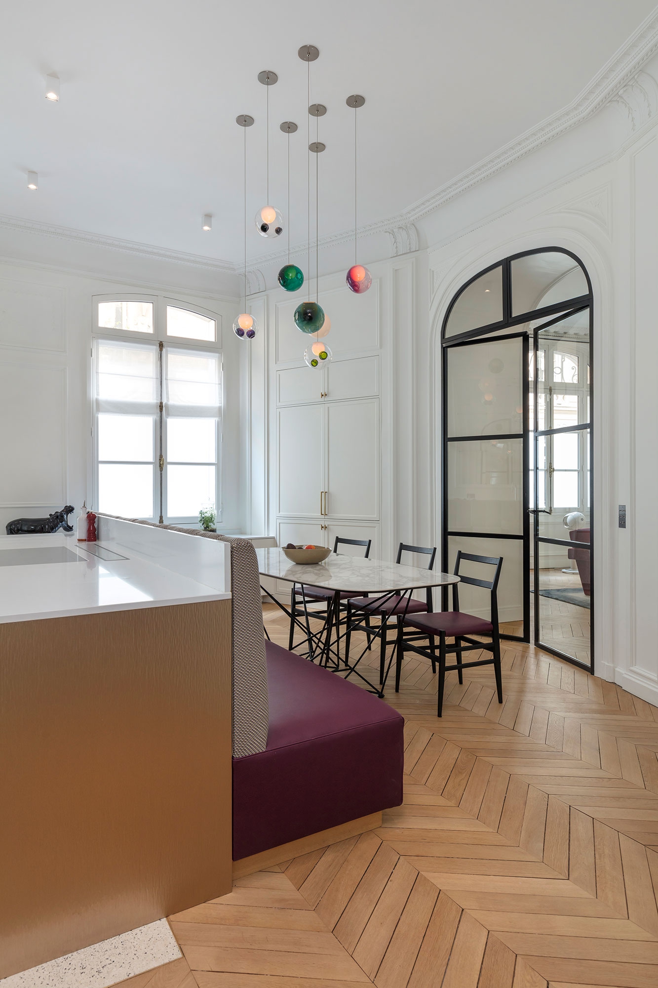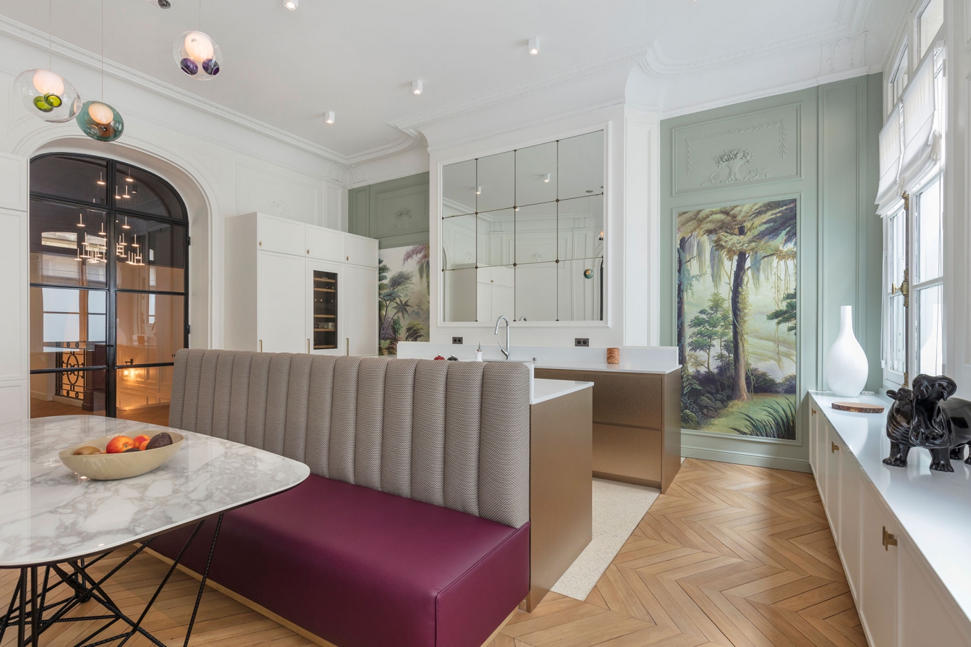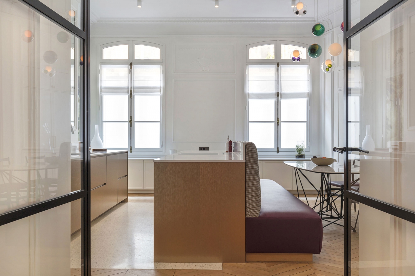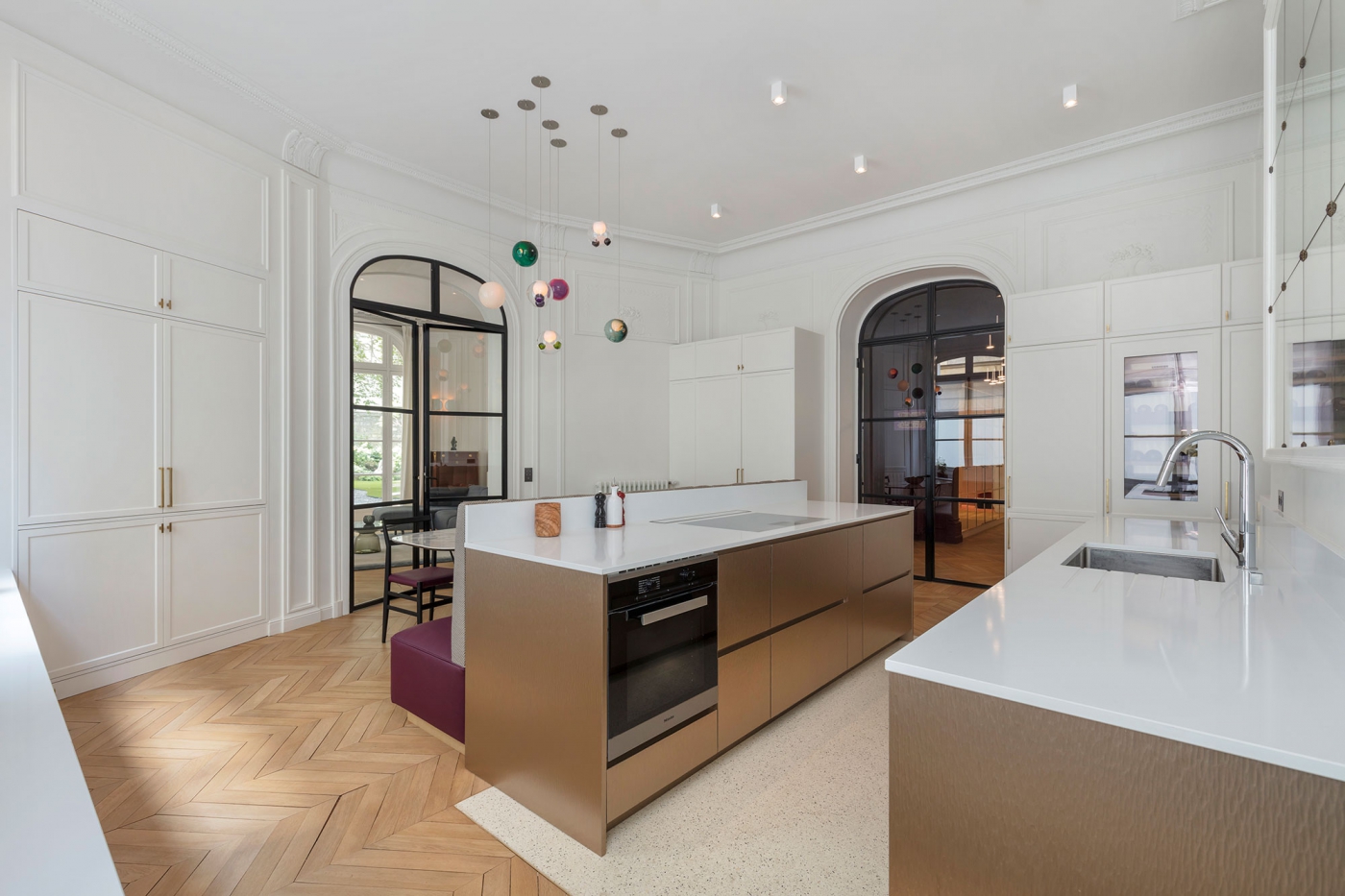The classic Haussmann style meets design and modernity in this large kitchen, imagined as a living room in its own right. The metal fronts, the white worktop and the terrazzo in shades of beige bring a lot of luminosity.