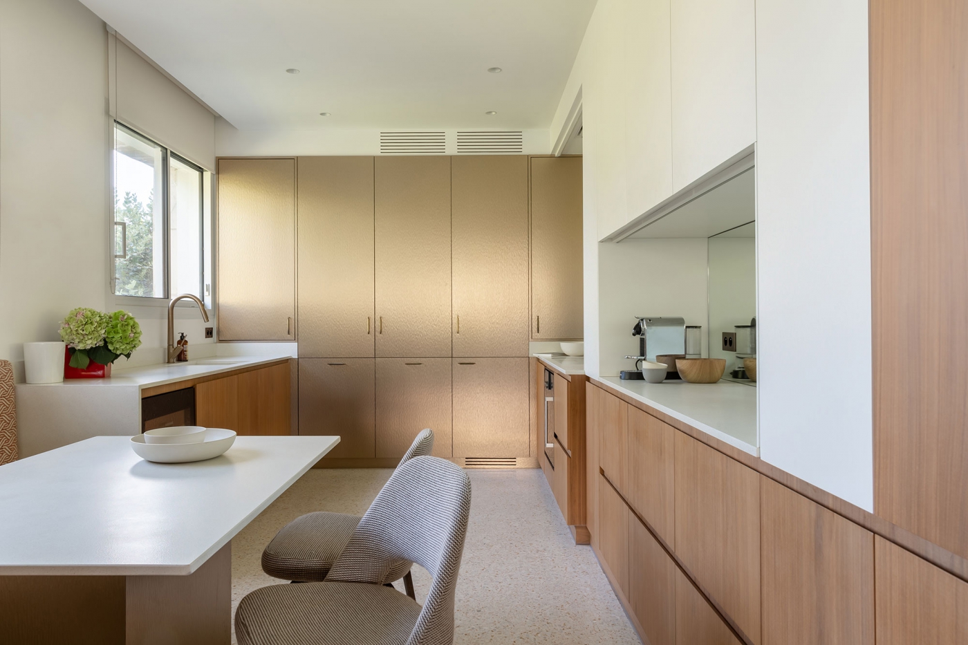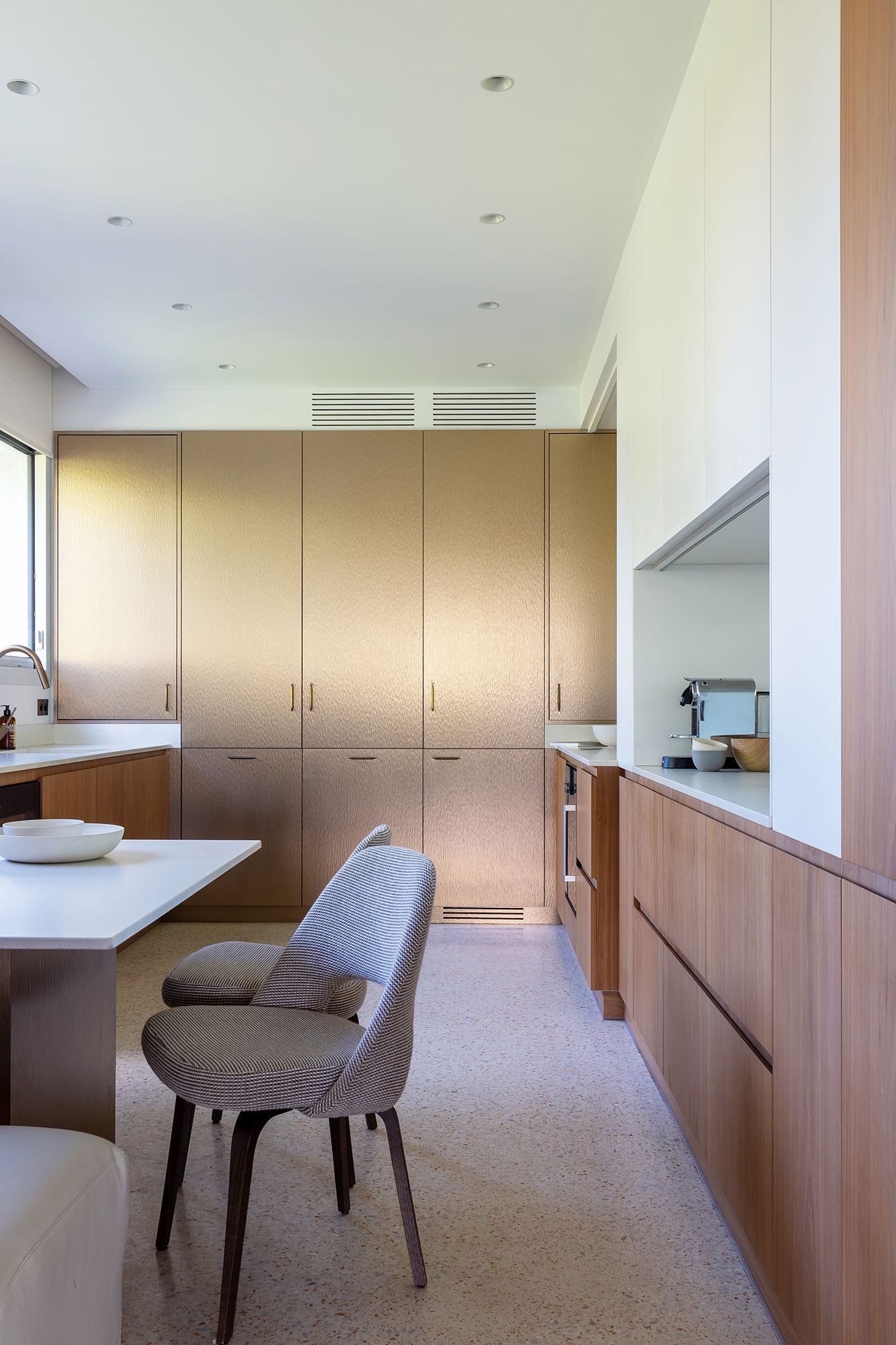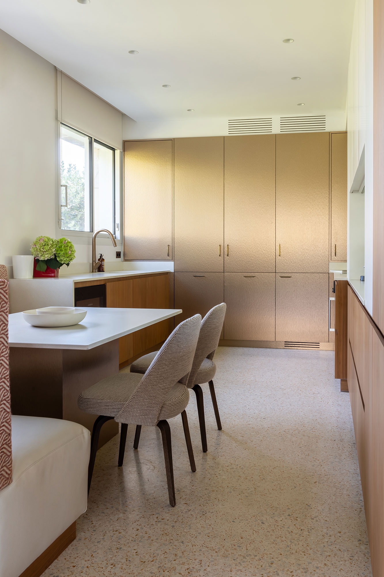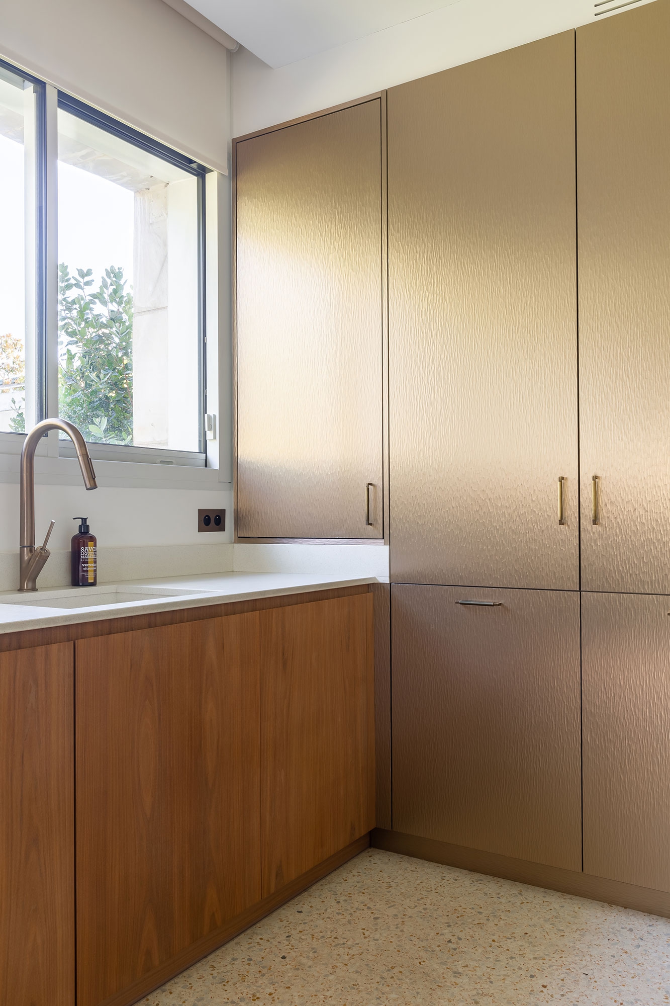 or the renovation of this 200 m2 duplex in Boulogne-Billancourt, the Santillane Design agency imagined a wall of "matter" with Oberflex gouged bronze fronts for the kitchen. Combined with walnut and terrazzo, the bronze brings elegance and a lot of light. As a reminder, it can be found on the central leg of the dining table and on the bar that distances the kitchen from the living room.