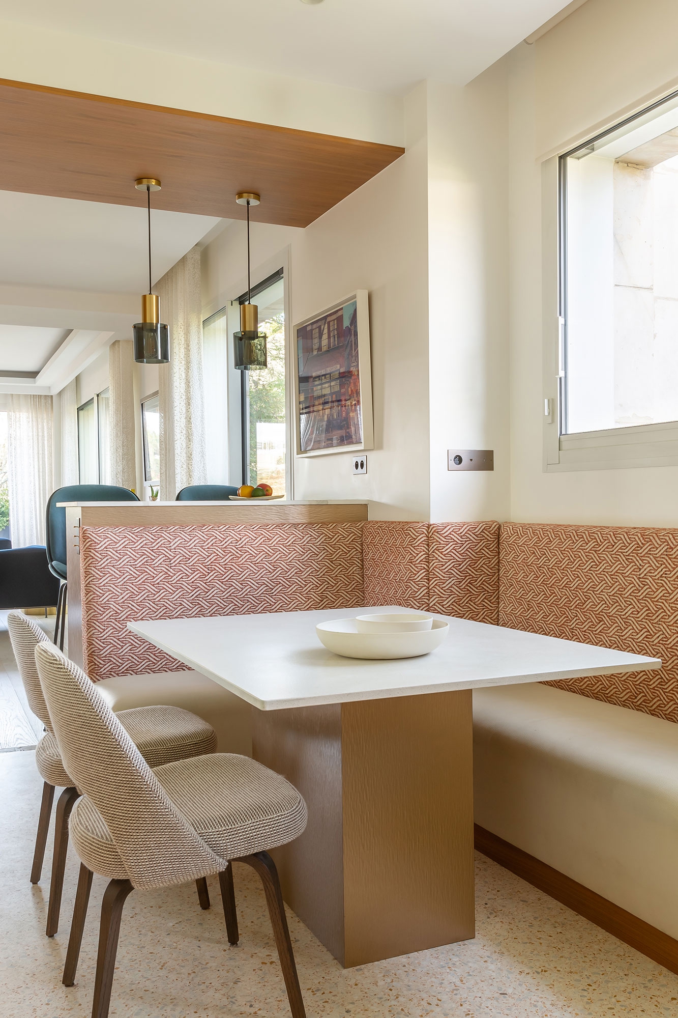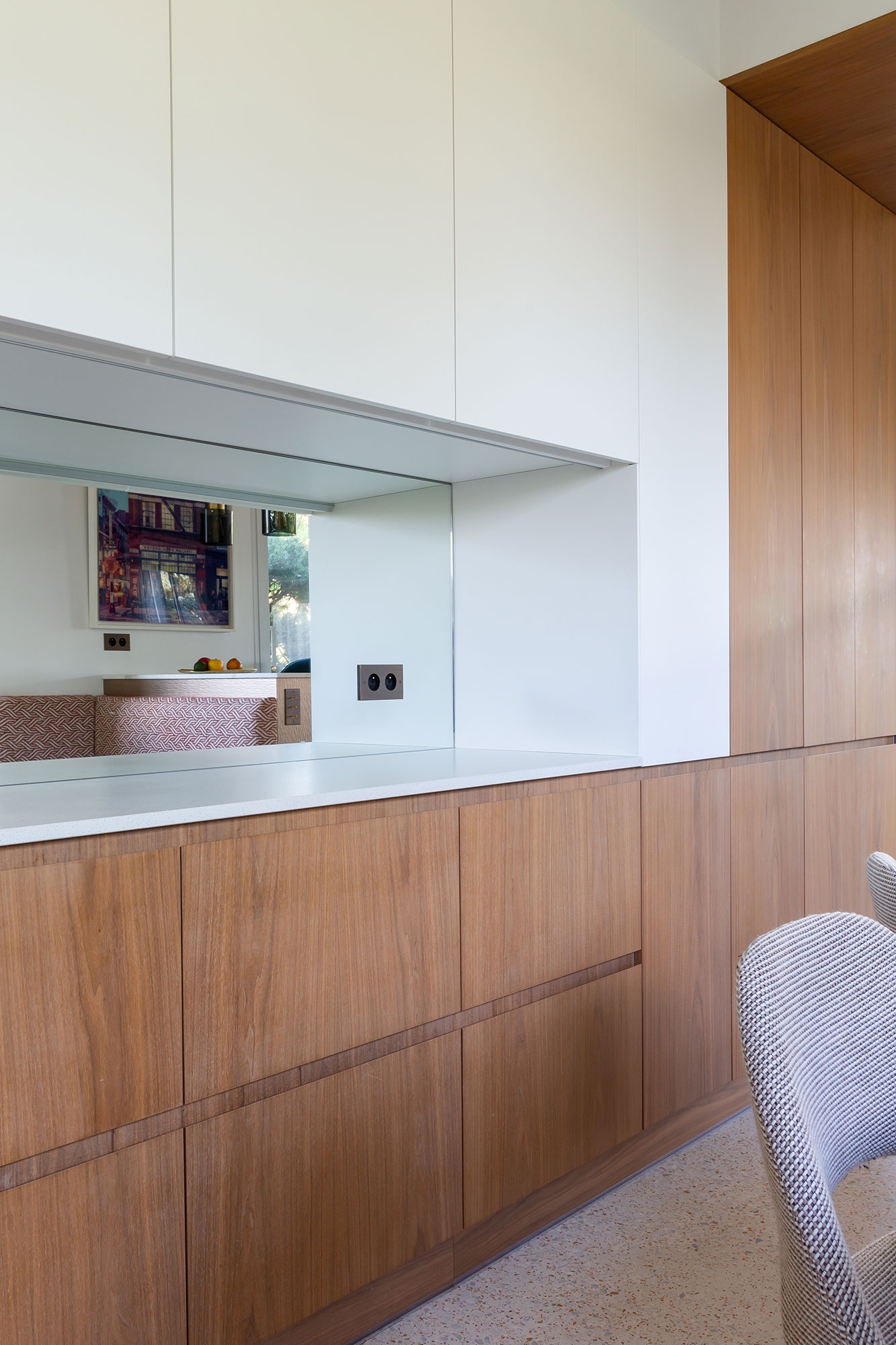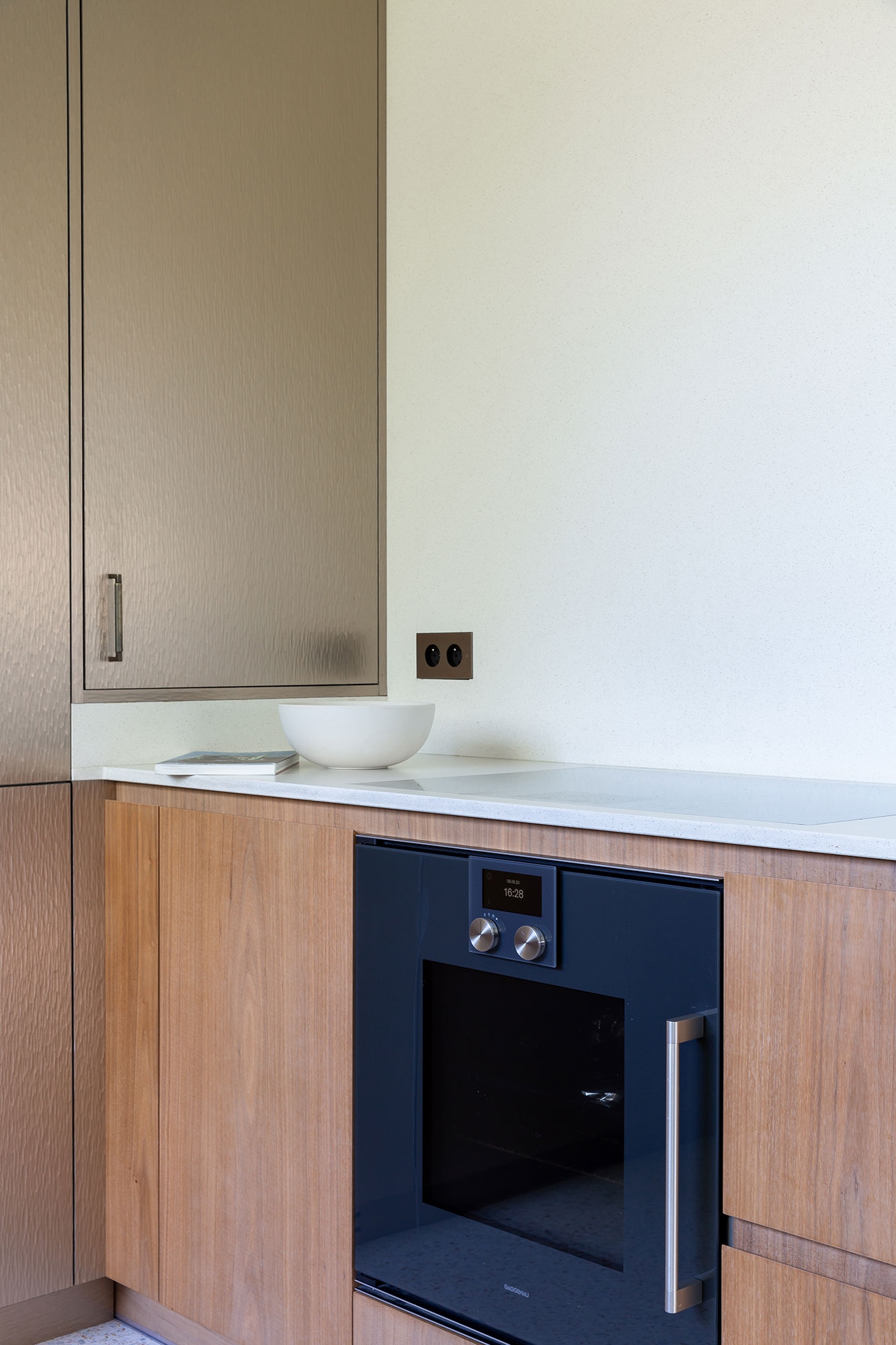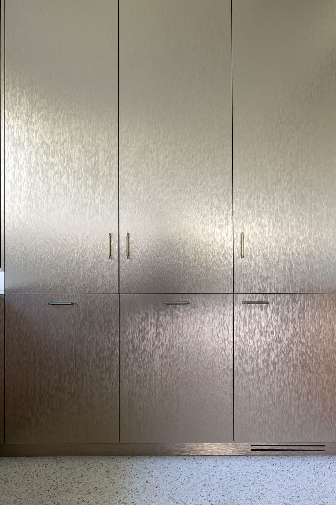 or the renovation of this 200 m2 duplex in Boulogne-Billancourt, the Santillane Design agency imagined a wall of "matter" with Oberflex gouged bronze fronts for the kitchen. Combined with walnut and terrazzo, the bronze brings elegance and a lot of light. As a reminder, it can be found on the central leg of the dining table and on the bar that distances the kitchen from the living room.