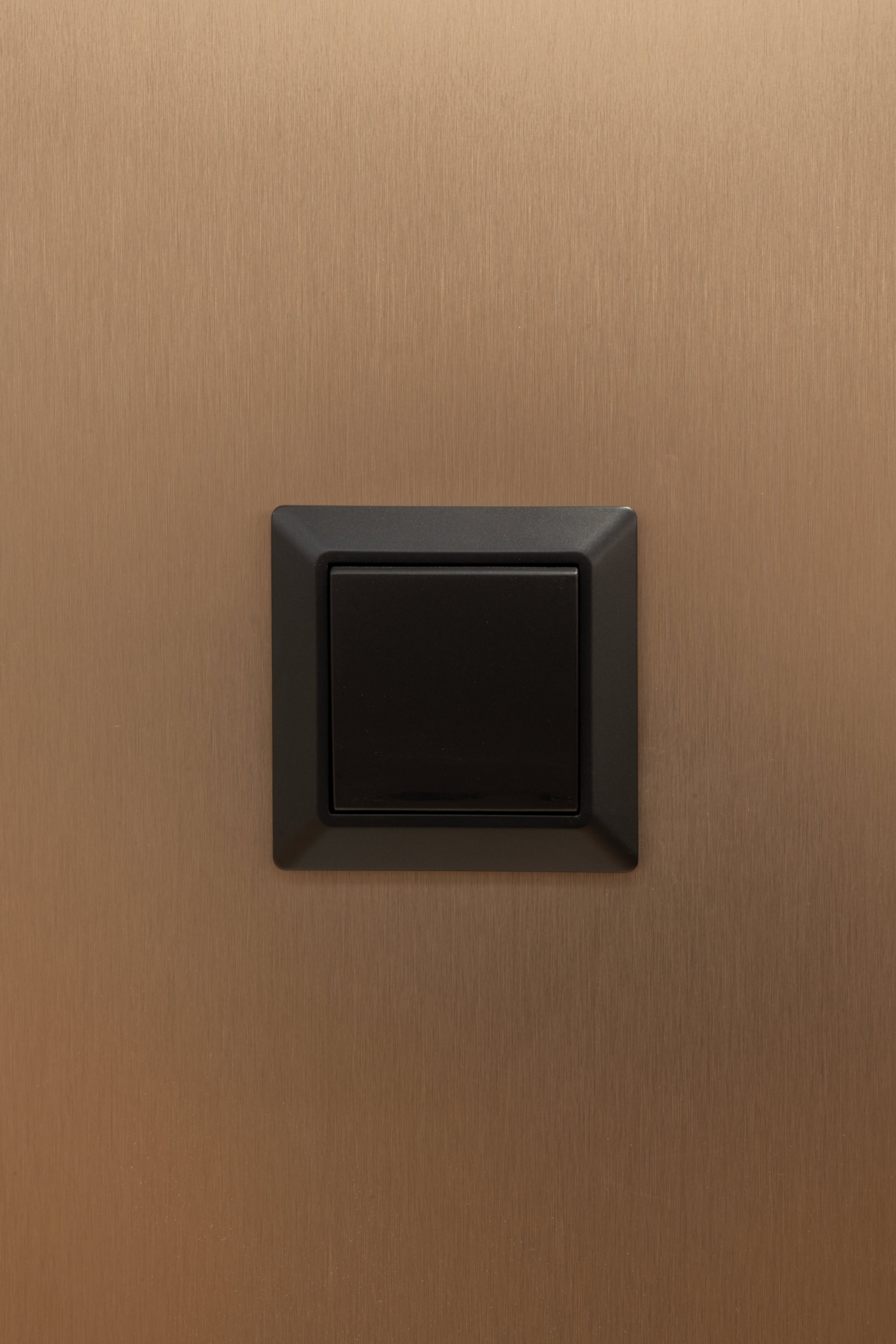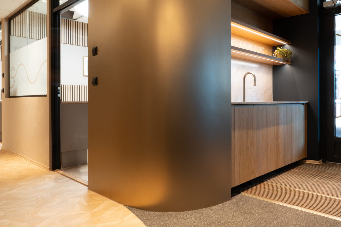La combinaison judicieuse du chêne naturel et du bronze crée une ambiance chaleureuse qui contribue à réduire l'anxiété. Le métal apporte une touche de modernité et de sophistication à l'espace et complète harmonieusement les nuances du chêne naturel griffé.