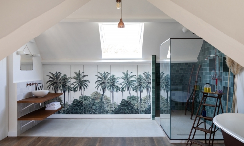 The architectural firm Bateaumagne has completely redesigned this atypical 500 m² seaside villa. A true family cocoon, this haven of peace reflects the owners' artistic universe. The Paille de Noyer and Paille de Chêne models from the SuperOrganic collection blend in perfectly in this case. They cover the walls of the corridors leading to the bedrooms and bathrooms like an invitation to calm. These two eco-designed models have been specially created by Oberflex with wood veneers from our production recovered during the cutting of the veneer sheets. The "Alpage and Cornflowers" and "Alpage and Roses" models bring a floral and olfactory touch to the rooms.
