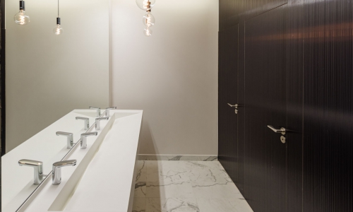 On this project, the architect had to work around several challenges such as incorporating a videoconferencing solution, lighting compatible with a variety of scenarios, and acoustic comfort. The response to this last challenge revolves around three main factors: absorption to limit reverberation, reflection to improve speech intelligibility and emission of sound waves to ensure good sound distribution throughout the space. The Dérive model from the Tectonique 5.5 collection used on the ceiling was also used as wall cladding.