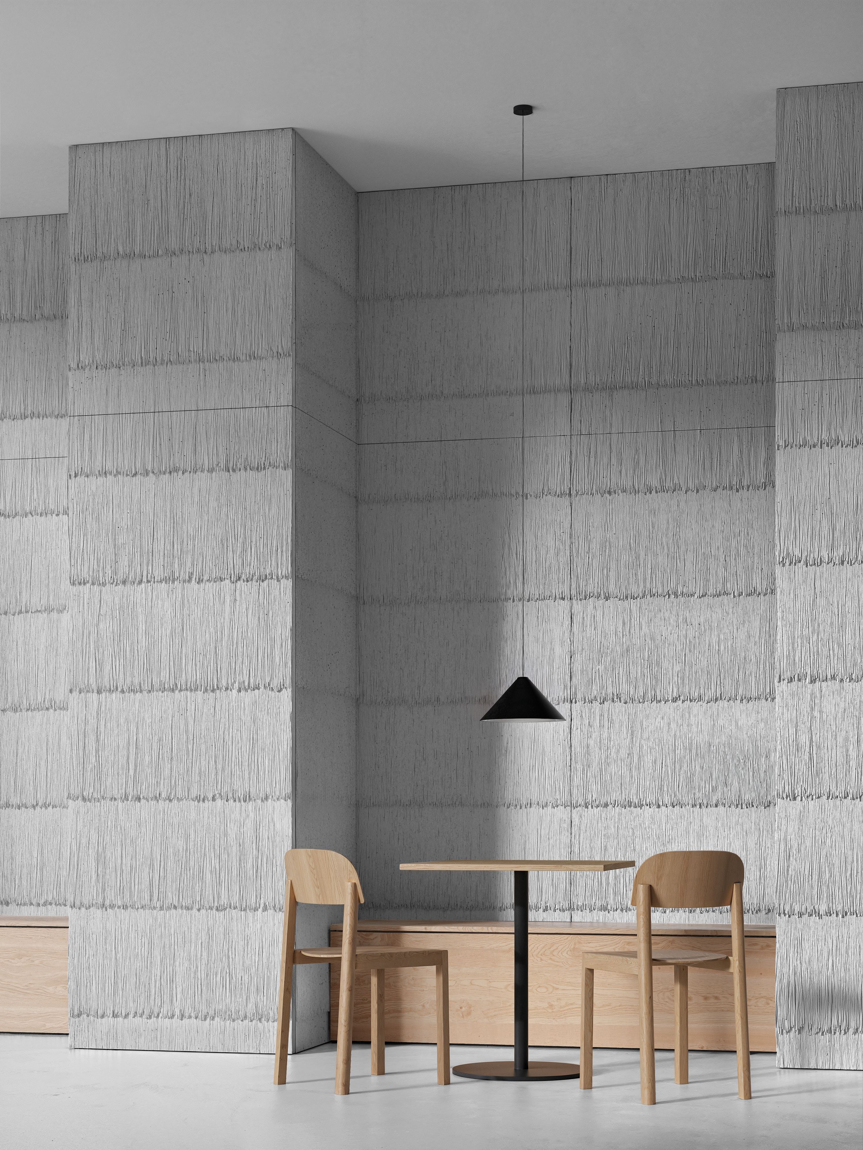 Pour donner vie à Comporta, nous avons travaillé main dans la main avec Jean-Baptiste Fastrez et nos ateliers. Après avoir sélectionné les types de paille les plus adaptés, nous avons composé un mur de paille unique et capté son empreinte pour la reproduire sur nos panneaux Panbeton®. Le résultat est une surface qui mêle réalisme et poésie, tout en restant reproductible en série.