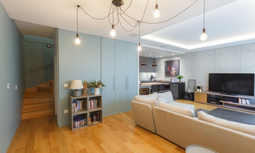 Interplay of materials and shapes: concrete perfectly matches the wood and staircase bannister. A successful modern finish with minimalist touches and geometry.