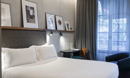Jean-Philippe Nuel creates a new look with a modular vision of this concept hotel room presented at the EquipHotel trade show. This luxury hotel room uses 2 mm Panbeton® Scaffolded panels which blend wood and concrete claddings with a designer touch.