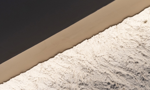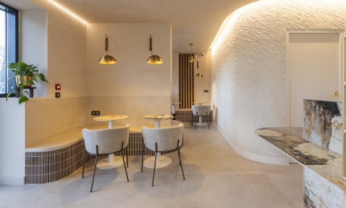 " The textures sculpted are evocative of finishes in motion, in an irregular, raw and tangible style. Those ‘coarse materials’, typically employed on exteriors, have now slipped into the world of interior architecture with singular poetics, endowing the ambiance with a living, pictorial dimension.”