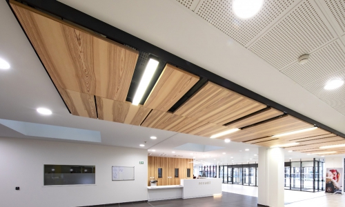 On this project, the architect had to work around several challenges such as incorporating a videoconferencing solution, lighting compatible with a variety of scenarios, and acoustic comfort. The response to this last challenge revolves around three main factors: absorption to limit reverberation, reflection to improve speech intelligibility and emission of sound waves to ensure good sound distribution throughout the space. The Dérive model from the Tectonique 5.5 collection used on the ceiling was also used as wall cladding.