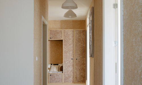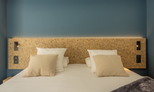 Avec ses moulures redorées, cette adresse haussmannienne située dans le 8ème arrondissement de Paris, conjugue standing d’époque et modernité tout en finesse. A la demande du promoteur, un soin particulier a été apporté sur l’origine des matériaux. Ainsi, le lieu est exclusivement constitué de mobilier et de matières fabriqués en France. Utilisé sur les murs de fond en arrière-plan des têtes de lits, le revêtement mural « Paille de Noyer » trouve sa place dans les chambres. Composé de produits 100% naturels et fabriqué avec les chutes de placages issues de la fabrication de nos panneaux d’essences fines, ce modèle est issu de la collection SuperOrganic by Oberflex.