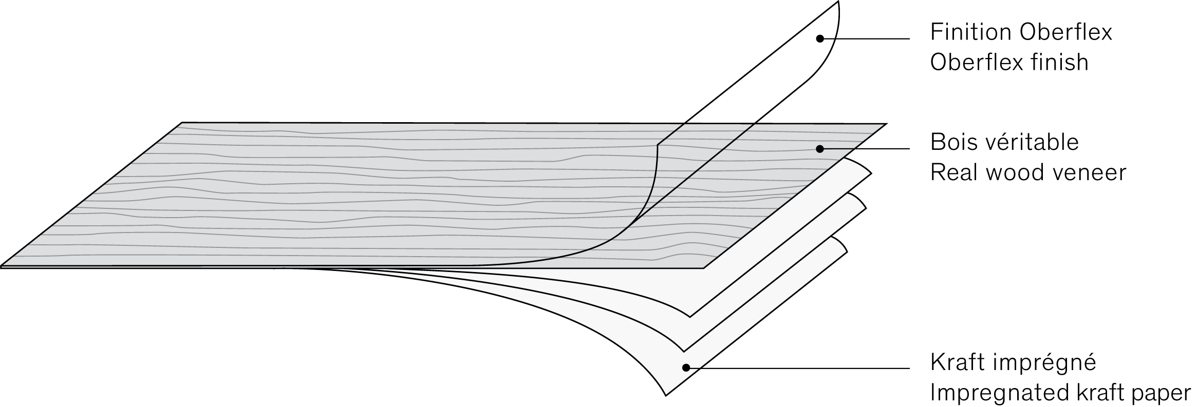 Certaines essences de la collection Prestige d’Oberflex peuvent être réalisées en fil travers (sens du fil dans la largeur du panneau). Nous consulter.