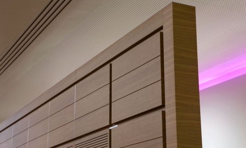 Ce sont les perforations effectuées au travers des parements décoratifs qui confèrent à ces panneaux d'agencement cette fonctionnalité supplémentaire : l'absorption acoustique. L'absorption partielle des ondes sonores réduit ainsi de manière significative la réverbération du son et les effets de résonnance ou d'écho.