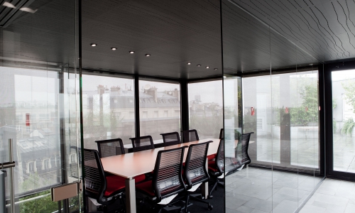 L’absorption acoustique concerne la capacité d’une paroi à absorber partiellement une onde sonore et de ne renvoyer vers le local d’émission qu’une partie de l’énergie reçue. Cette propriété permet donc de réduire la réverbération d’un lieu, d’accroître le confort acoustique et l’intelligibilité de la parole. L’absorption acoustique des plafonds Tectonique 5.5, est générée par la position des dalles, les espaces entre elles et par les caractéristiques du matériau.
