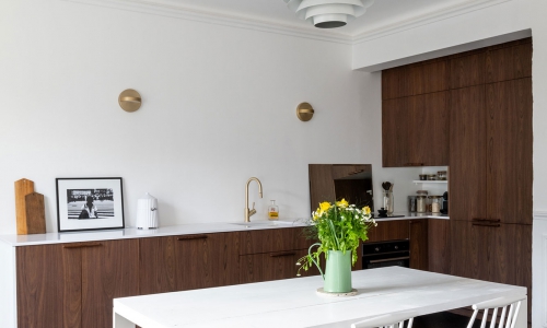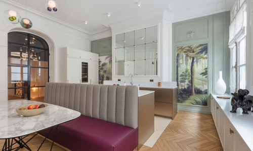 Le bronze gougé d'Oberflex habille avec élégance la cuisine dessinée par Santillane Design et fabriquée sur-mesure. La verrière fait entrer la lumière dans la cuisine qui communique avec la salle à manger colorée.