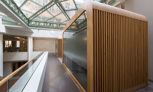 Le projet de l'espace d'accueil était double : créer un environnement prestigieux en introduisant des matériaux de haute qualité et fournir un cadre approprié pour les expositions. Il débouche sur l'espace polyvalent où, selon l'organisation, des réunions, des ateliers ou des séminaires peuvent être organisés.
